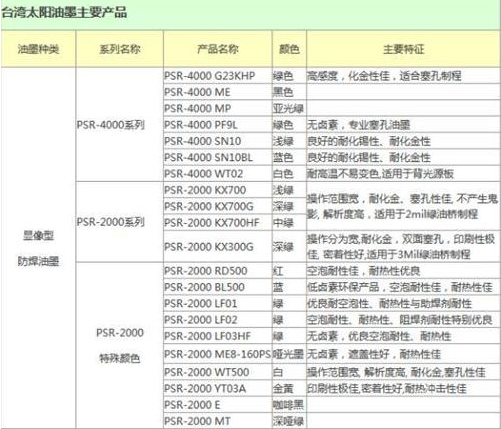 以上是太陽油墨產(chǎn)品特性表,可以發(fā)現(xiàn),綠色油墨比起其他顏色的油墨,具有更好的特性,尤其綠色的塞孔特性。