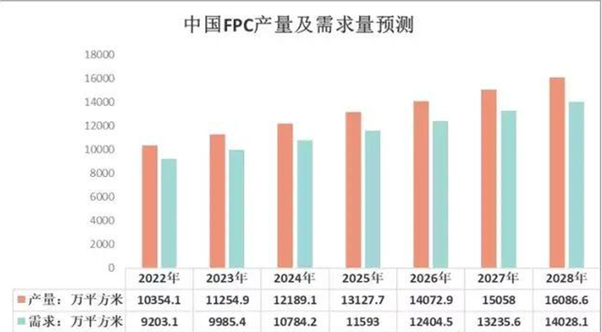 近年來,我國電子信息產(chǎn)業(yè)發(fā)展迅速,產(chǎn)業(yè)規(guī)模不斷擴大。智能手機、平板電腦等電子產(chǎn)品蓬勃發(fā)展,車載電子、可穿戴智能設(shè)備、消費級無人機等市場也在迅速崛起,為FPC行業(yè)的發(fā)展提供了充足的動力。預(yù)測未來我國FPC市場將會繼續(xù)增長,預(yù)測2028年我國FPC產(chǎn)量為16086.6萬平方米,需求量為14028.1萬平方米。2022-2028年中國FPC產(chǎn)量及需求量預(yù)測。