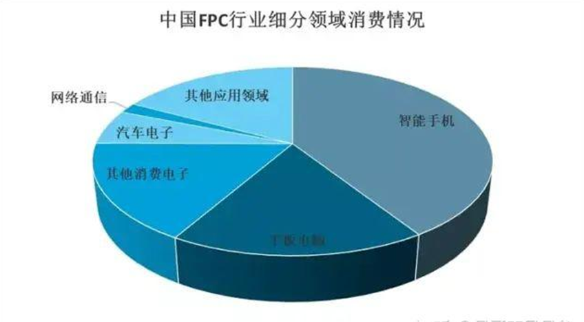 目前,國內(nèi)FPC行業(yè)消費領(lǐng)域仍然主要集中在消費電子領(lǐng)域,尤其是智能手機和平板電腦。此外,科技的發(fā)展把汽車產(chǎn)業(yè)由電子化時代帶入自動化時代,汽車智能化水平的不斷提高,使應(yīng)用于汽車電子領(lǐng)域的FPC占比不斷提高。