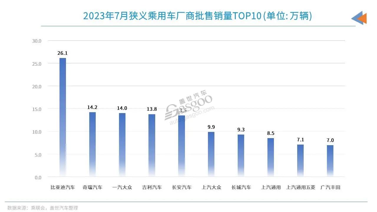 在7月車企銷量前十榜單上,自主和合資登榜的數(shù)量旗鼓相單,但月度銷量冠、亞軍,都被自主車企收入囊中。其中比亞迪依舊是一家獨大,月銷量超過26萬輛,是7月唯一一家銷量破20萬輛的國內(nèi)乘用車企業(yè)。