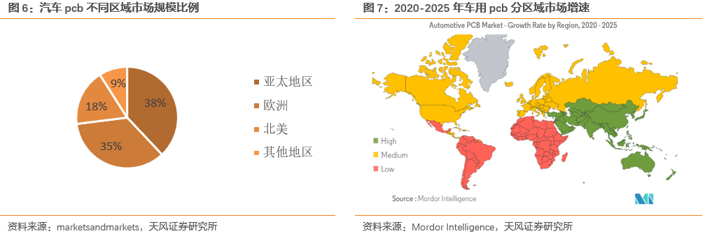 亞太地區(qū)是規(guī)模最大市場,同時(shí)是增長最快的市場。分區(qū)域來看,亞太地區(qū)車用PCB市場規(guī)模位列全球首位,占據(jù)全球38%的市場份額,同時(shí)根據(jù)Mordor Intelligence的預(yù)測(cè),未來亞太地區(qū)市場將成為增速最高的市場。其中我們認(rèn)為,中國市場也將成為快速增長,充滿機(jī)遇的市場。