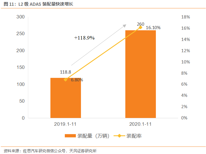 ADAS滲透率持續(xù)提升,未來預(yù)計(jì)裝配量仍將持續(xù)增長。根據(jù)佐思汽研的數(shù)據(jù),2020年1-11月份配備L2級(jí)自動(dòng)駕駛功能的乘用車上險(xiǎn)量260.0萬輛,同比增長118.9%;裝配率16.1%,比上年同期增加9.3個(gè)百分點(diǎn)。盡管受多重負(fù)面影響,L2裝配量實(shí)現(xiàn)逆勢(shì)上漲,市場表現(xiàn)出需求強(qiáng)勁。