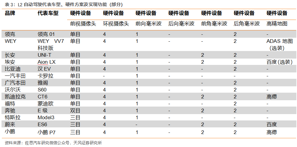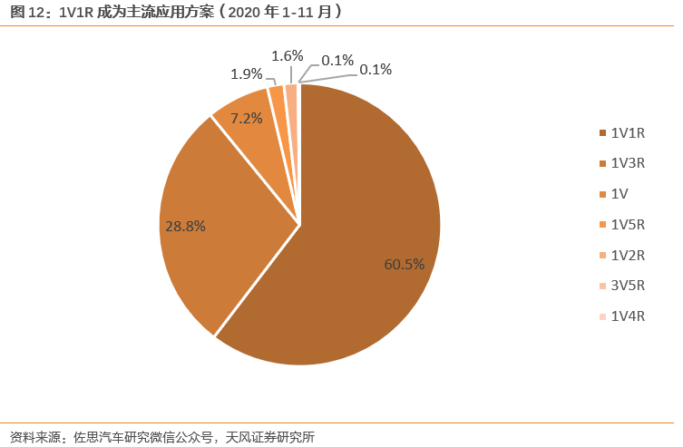 自動(dòng)駕駛驅(qū)動(dòng)攝像頭與雷達(dá)需求,1V1R目前為主流應(yīng)用。根據(jù)佐思汽研的數(shù)據(jù),2020年1-11月,L2級(jí)功能的主流方案有1V1R(1攝像頭+1前向毫米波雷達(dá))、1V3R(1攝像頭+1前向毫米波雷達(dá)+2后角雷達(dá))兩種,合計(jì)市場占比到89.3%,其中1V1R方案占比最大,為60.5%。造車新勢(shì)力以及部分車企采用了2后角雷達(dá),預(yù)計(jì)未來攝像頭與毫米波/激光雷達(dá)的應(yīng)用量將增加。