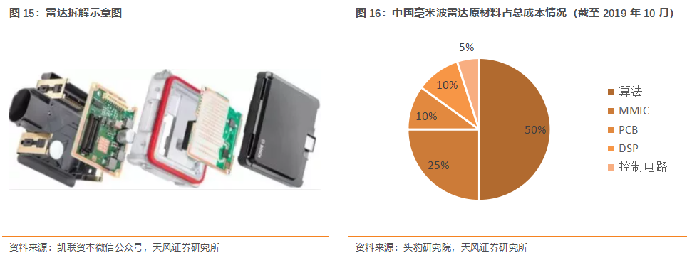 毫米波雷達(dá)基于PCB構(gòu)成。毫米波雷達(dá)的構(gòu)成中包括控制電路、DSP、算法、PCB等,PCB為其中的基礎(chǔ)支撐,對(duì)于毫米波雷達(dá)的性能具有重要的影響。根據(jù)頭豹研究院數(shù)據(jù),截至2019年10月,中國毫米波雷達(dá)成本構(gòu)成中,PCB占約10%的比例。