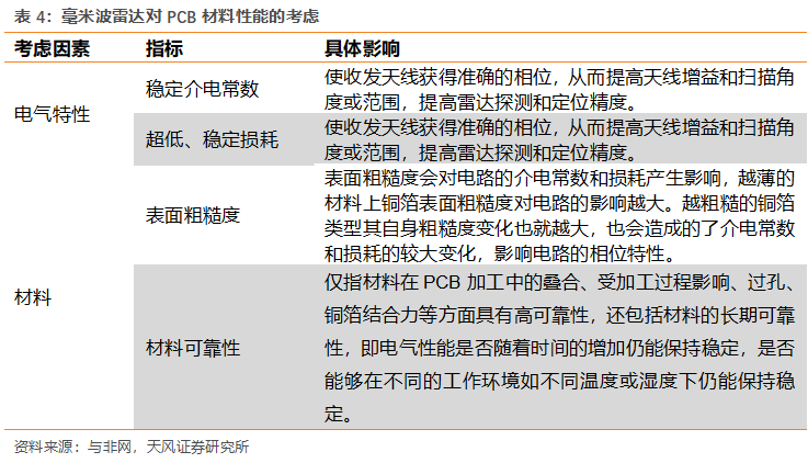 77GHz毫米波雷達(dá)對(duì)于PCB要求提升,帶動(dòng)PCB價(jià)值量提升。在毫米波雷達(dá)中PCB對(duì)其性能具備一定影響,所以對(duì)于PCB的性能要求隨之提升。包括材料的電氣特性、材料的可靠性方面需要有嚴(yán)格的考量,以提高天線增益和掃描角度或范圍,滿足雷達(dá)探測(cè)和定位精度以及保證在不同的工作環(huán)境如不同溫度或濕度下仍能保持穩(wěn)定。