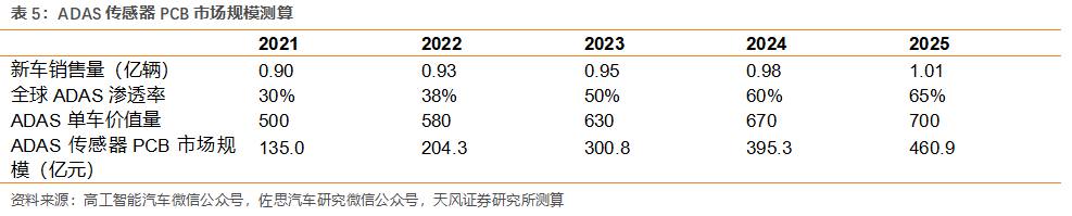 FPC廠由此計(jì)算得到2021-2025年全球ADAS傳感器PCB市場規(guī)模分別為135.0/204.3/300.8/395.3/460.9億元,期間CAGR達(dá)到35.9%。