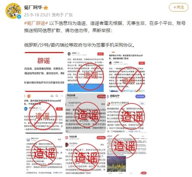 華為表示,造謠者毫無根據(jù),無事生非,在多個平臺、賬號推送相同信息擴(kuò)散,請網(wǎng)友勿信勿傳,果斷舉報(bào)。