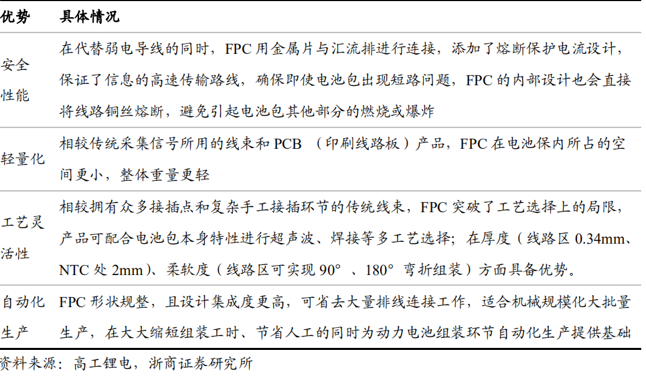 相較銅線線束,F(xiàn)PC 由于其高度集成、超薄厚度、超柔軟度等特點,在安全性、輕量化、布局規(guī)整等方面具備突出優(yōu)勢,此外 FPC 厚度薄,電池包結構定制,裝配時可通過機械手臂抓取直接放置電池包上,自動化程度高,適合規(guī)?;笈可a,F(xiàn)PC 替代銅線線束趨勢明確。