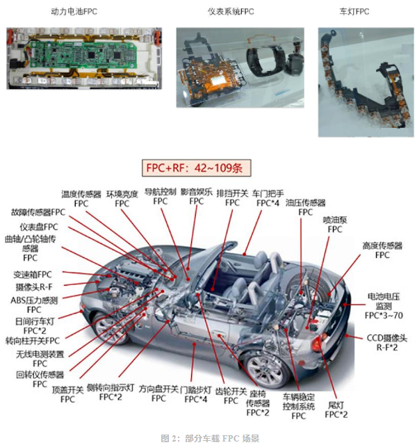 隨著汽車電動化、智能化發(fā)展,F(xiàn)PC在彎折性、減重、自動化程度高等優(yōu)勢進一步體現(xiàn),F(xiàn)PC 在車載領域的用量不斷提升,應用涵蓋車燈、顯示模組、BMS/VCU/MCU 三大動力控制系統(tǒng)、傳感器、高級輔助系統(tǒng)等相關場景。新能源汽車的大發(fā)展帶動車載動力電池用 FPC 需求大幅增長。