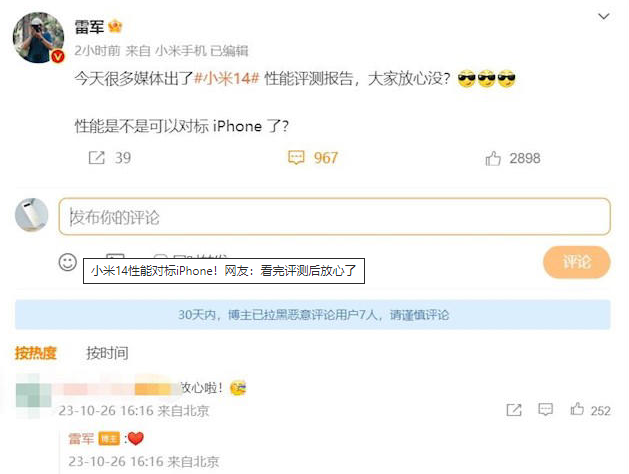 FPC廠了解到,10月26日,小米14性能部分評測正式解禁,有網(wǎng)友給小米創(chuàng)辦人雷軍留言,表示“看完評測報(bào)告后對小米14放心了”。