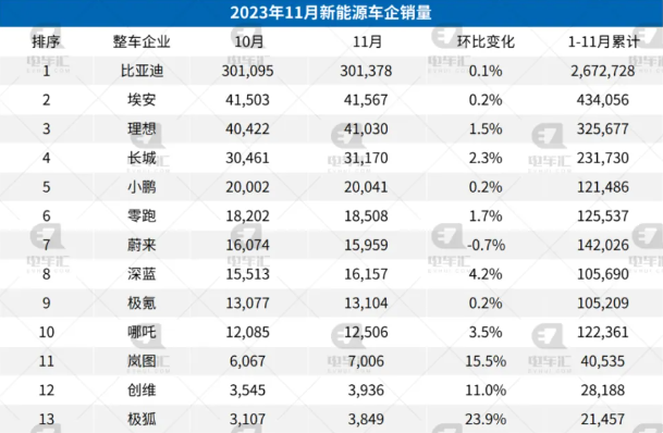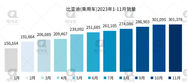 比亞迪11月新能源乘用車銷量301,378輛,同比增長31%,環(huán)比上月增加了283輛。1-11月累計銷量2,672,728輛,同比增長65%。今年前11個月比亞迪集團新能源汽車累計銷量268.3萬輛,距離全年300萬輛的目標還有近32萬輛。
