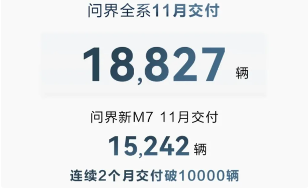 其中問界11月交付新車18,827輛,問界新M7交付1,5242輛,上市以來該車累計交付27,000輛,而截至日前大定量已超10萬輛。