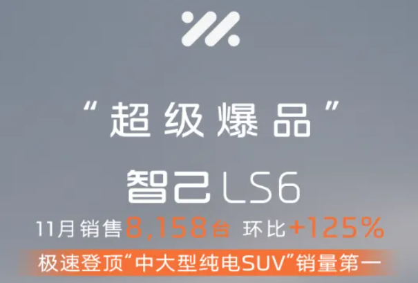 智己汽車11月共計銷售8,703輛,其中智己LS6銷售8,158輛,環(huán)比增長125%。