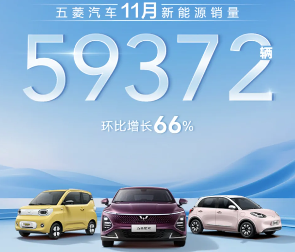 FPC軟板廠了解到,五菱汽車11月新能源銷量59,372輛,環(huán)比增長66%。