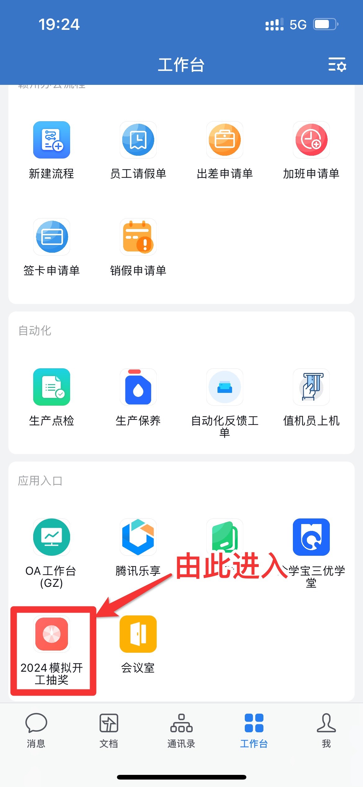 進(jìn)入企業(yè)微信,點(diǎn)擊“工作臺(tái)”→“應(yīng)用入口”→“2024開工抽獎(jiǎng)”→進(jìn)入抽獎(jiǎng)頁面;