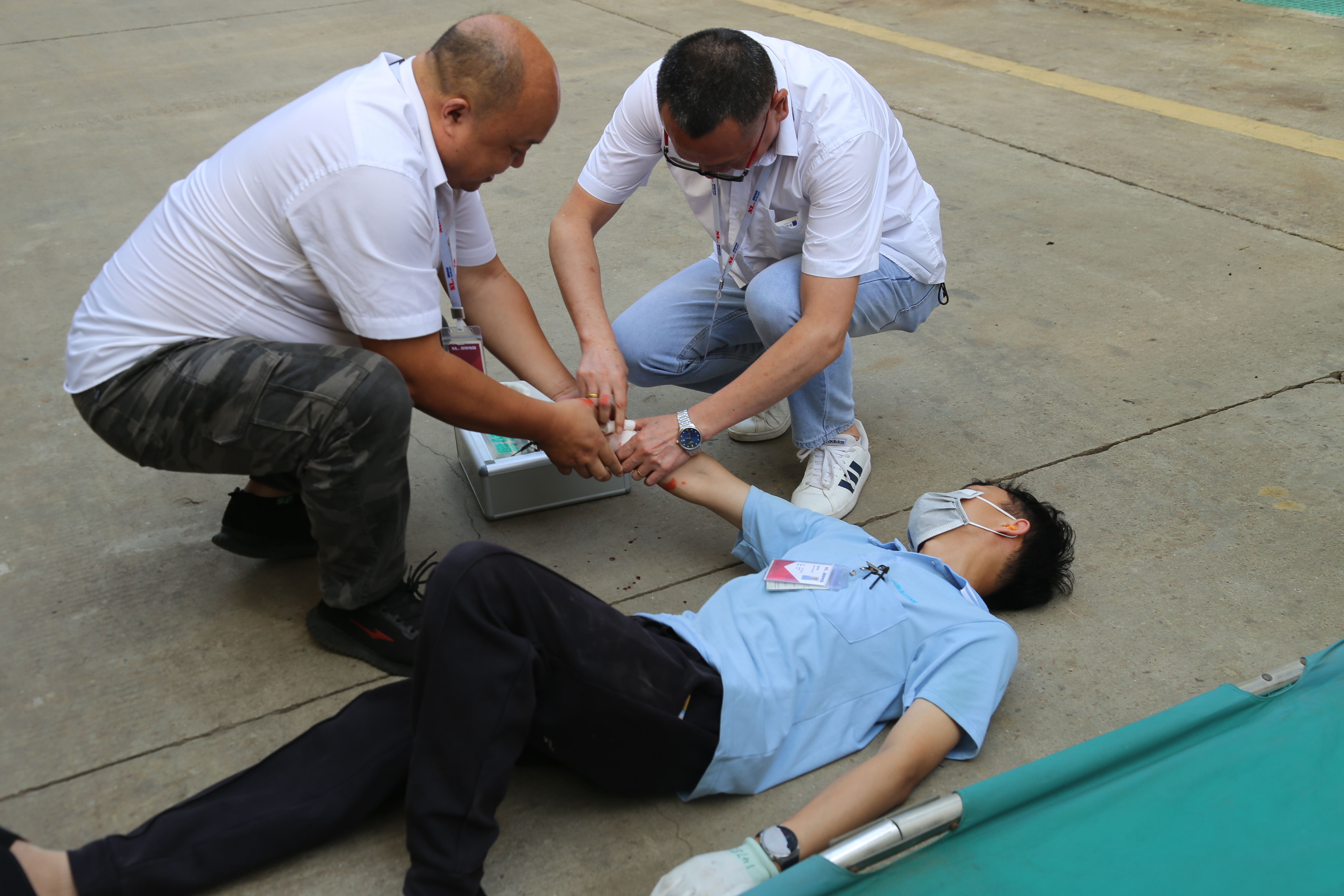 與此同時(shí),救護(hù)組也迅速出動(dòng),攜帶擔(dān)架和急救藥箱,以最快的速度趕赴“火場(chǎng)”,將“傷員”安全救出,并進(jìn)行了現(xiàn)場(chǎng)施救。
