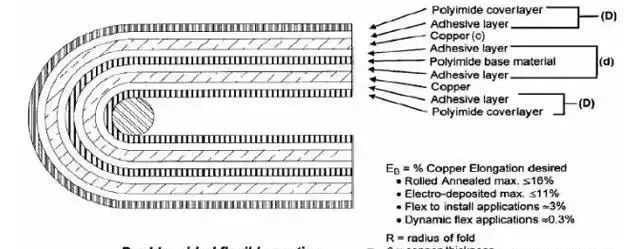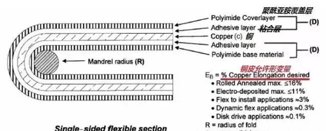其中:R=最小彎曲半徑、單位µm、c=銅皮厚度、單位µm、D=覆蓋膜厚度、單位µm、EB=銅皮變形量,以百分?jǐn)?shù)衡量。