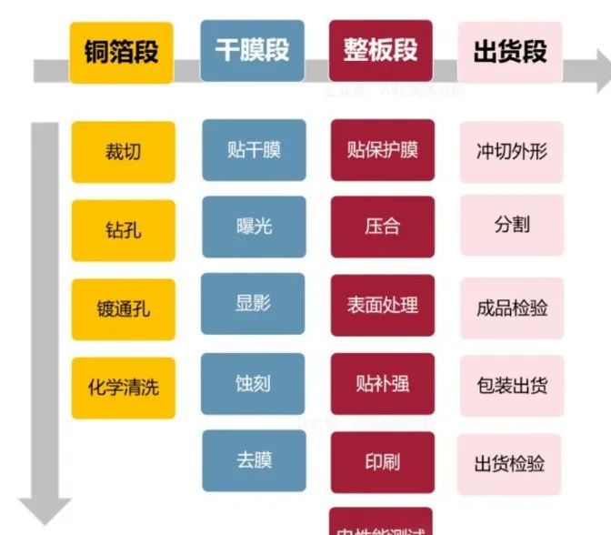 雙面板:開料→ 烘烤→ 鉆孔→ 黑孔 → VCP→ 前處理→ 貼干膜 →曝光→ 顯影 → 蝕刻 → 脫膜 → 前處理→ 貼覆蓋膜 → 壓合 → 固化→ 表面處理→ 電測→ 裝配 → 壓合 → 固化→ 文字 →外形→ 終檢→包裝 出貨。