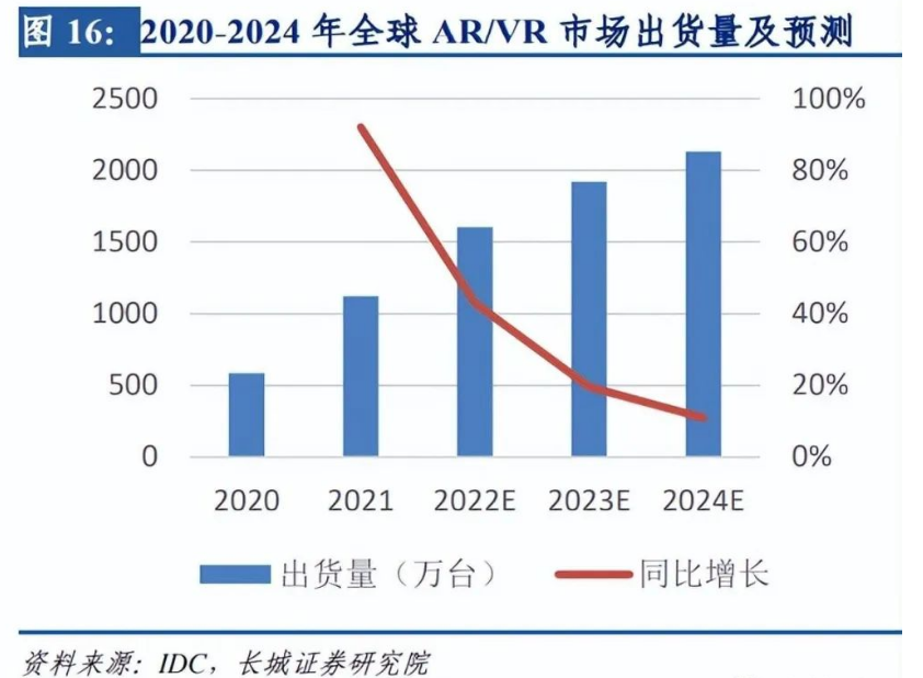 VR/AR頭顯設(shè)備市場爆發(fā),促進(jìn)FPC用量提升。目前AR/VR設(shè)備從普通機(jī)型到中高端機(jī)型,單機(jī)用FPC用量范圍可達(dá)10至20條,部分高端機(jī)型由于傳感器多、電路復(fù)雜、對于產(chǎn)品重量和性能要求更嚴(yán)格等因素,F(xiàn)PC用量更多,可能在20條以上。未來隨著產(chǎn)品迭代升級(jí),功能更加豐富,引入的傳感器攝像頭數(shù)目更多,產(chǎn)品對于輕量化、散熱性能的要求提升,F(xiàn)PC用量會(huì)進(jìn)一步增加。全球AR/VR市場出貨量有望從2020年的585萬臺(tái)增長至2024年的2130萬臺(tái),年均復(fù)合增長率為29.49%。中國VR設(shè)備出貨量整體呈現(xiàn)增長趨勢,2021年約為169萬臺(tái),預(yù)計(jì)2025年出貨量為1266萬臺(tái),F(xiàn)PC作為VR/AR的重要組成部分之一,市場潛力巨大。