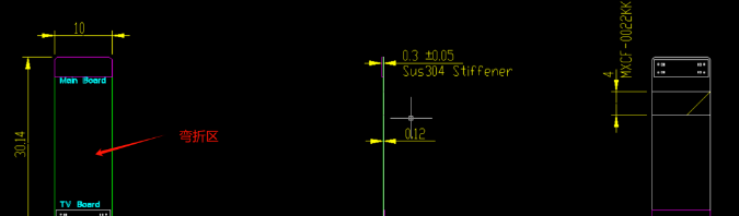 可以隨意彎折是FPC軟板的最大優(yōu)勢(shì),因此它的彎折區(qū)要特別關(guān)注下,這是一個(gè)FPC項(xiàng)目中結(jié)構(gòu)工程師給出的一個(gè)三視圖圖紙,這是一個(gè)副板連接主板的FPC排線,中間部分就是需要彎折的地方。