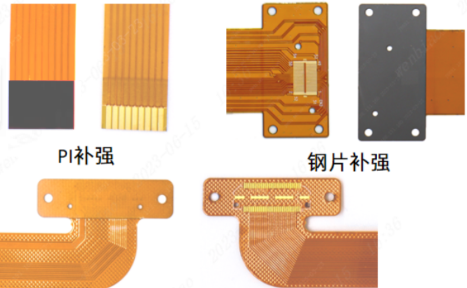 軟板廠FPC補(bǔ)強(qiáng)的材質(zhì)一般有PI、FR4和鋼片3種,如下圖所示,補(bǔ)強(qiáng)區(qū)一般在金手指、按鍵或連接器的背面,對(duì)補(bǔ)強(qiáng)區(qū)的要求就是不能放置元器件和絲印文字等,比如絲印文字,補(bǔ)強(qiáng)后文字就被遮擋了。